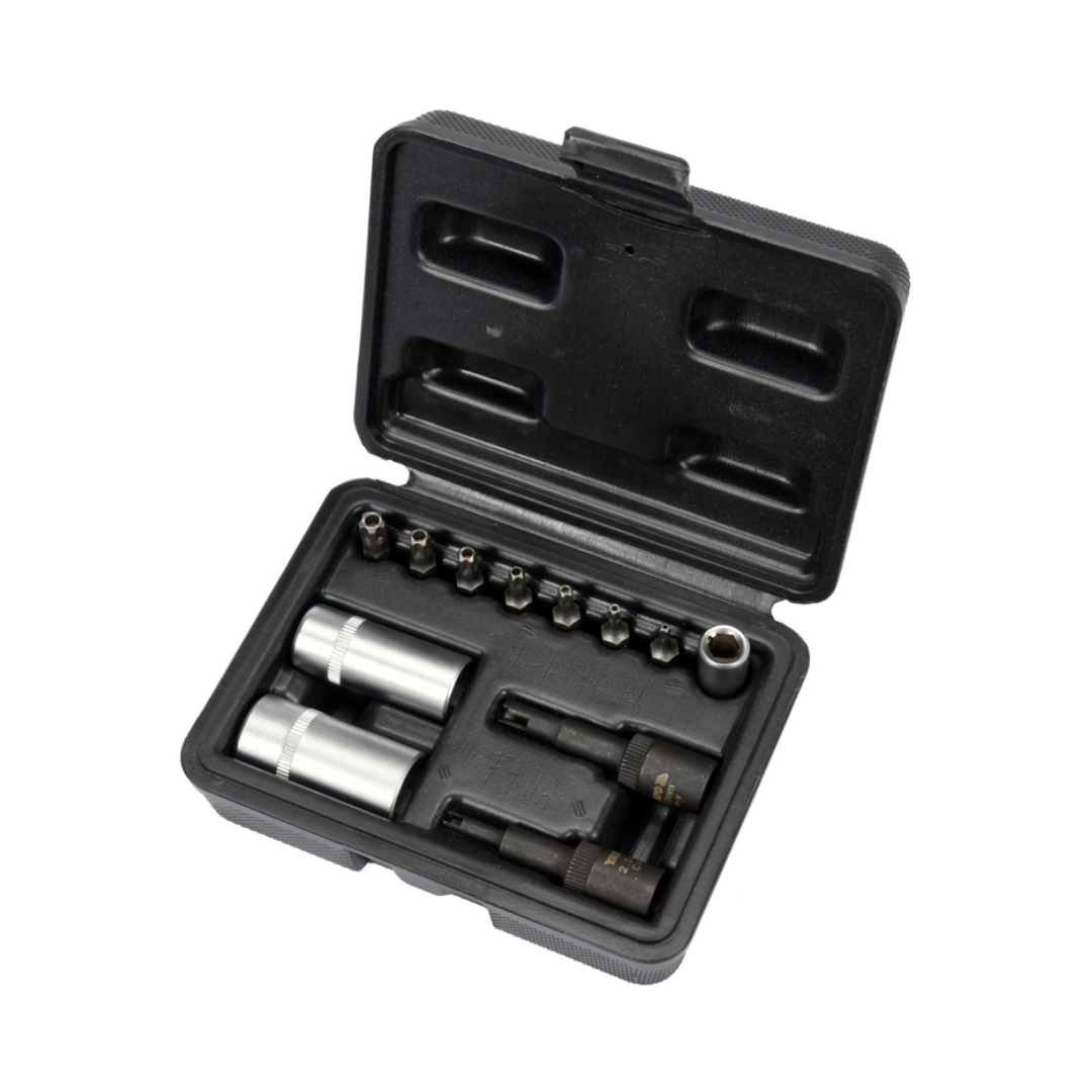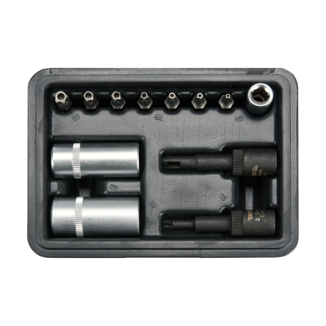 • Incluye vasos octogonales de 12 y 15 mm, vasos de 2,2 y 3,2 mm para machos planos, adaptador y puntas pentagonales de TS10 a TS40 con agujero
